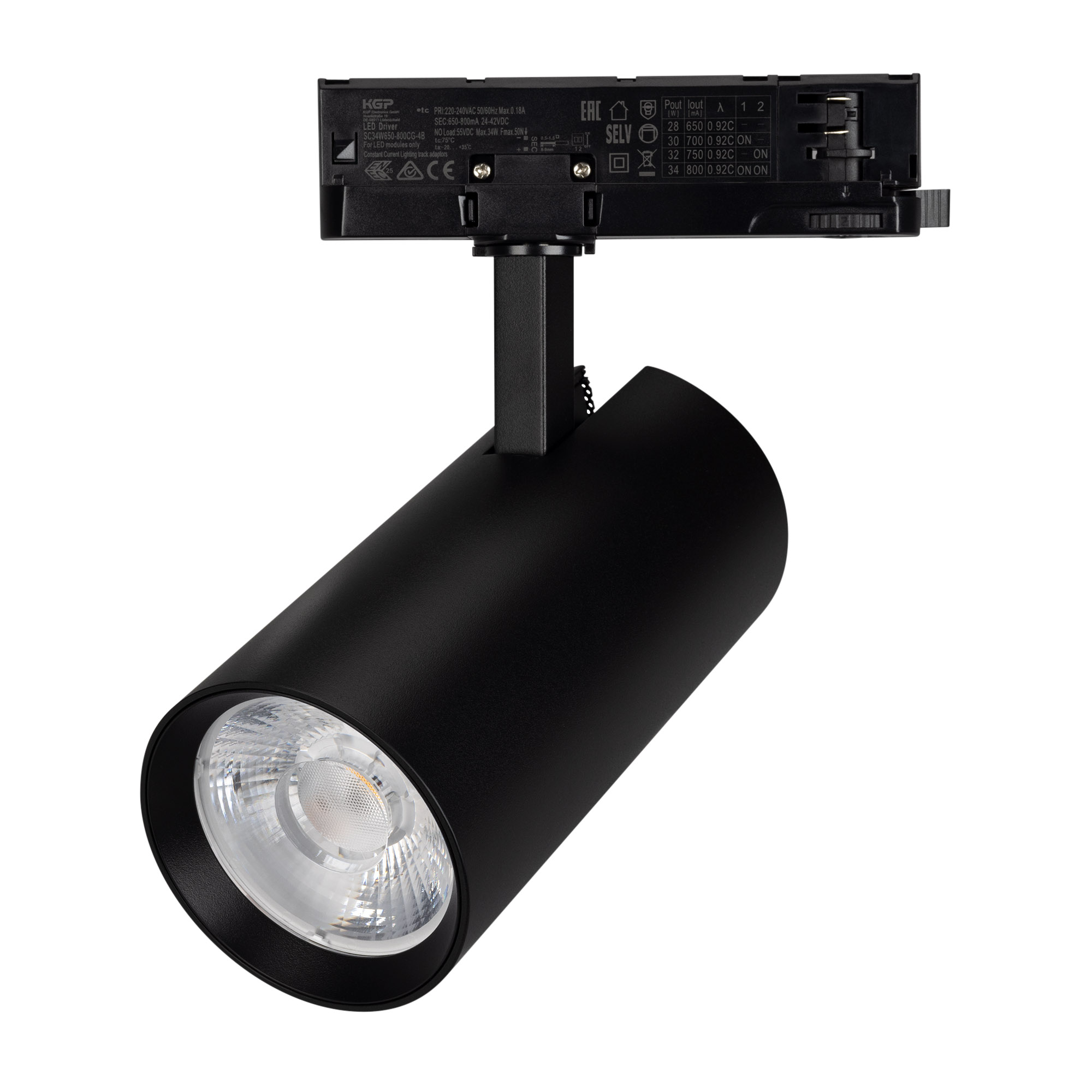 Светильник для треков/шин 4 провода. Мощность 30 Вт, св. поток без решетки honeycomb 3000 лм, 100 лм/Вт, с решеткой honeycomb 1980 лм, 66 лм/Вт, дневной 4000 K, CRI>90, угол 15°, напряжение питания 230 В. Черный круглый корпус из алюминия, материал линзы PMMA, степень защиты IP20. Размер: диаметр 90 мм, длина световой части 141 мм. Монтаж на трек 3-фазный. Драйвер встроенный 24-42 В, 750мА., пульсация <5%